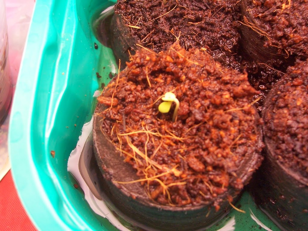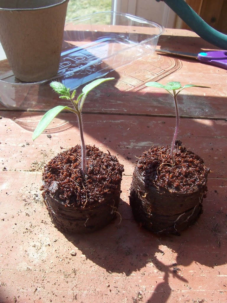 I also repotted tomatoes after writing yesterday’s blog post. They have their first true leaves coming in and have roots on the edge of their pellets too. I did them the same way I did the cabbage and kale.