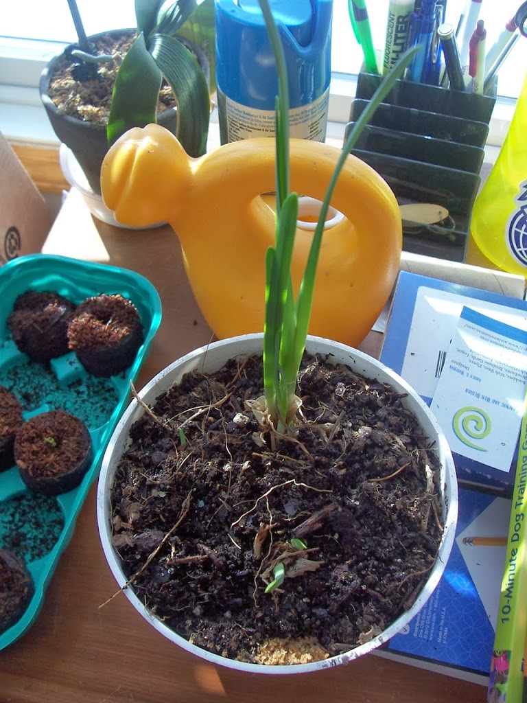 I also found some bulbs from last year that I’m pretty sure are narcissus. They somehow lost dirt or pushed themselves out of the dirt since last year. I noticed some little bulbs on the sides, but they are already sprouting, so I wasn’t sure what to do. I just put dirt on top and will worry about dividing later! Hopefully they won’t be too crowded.