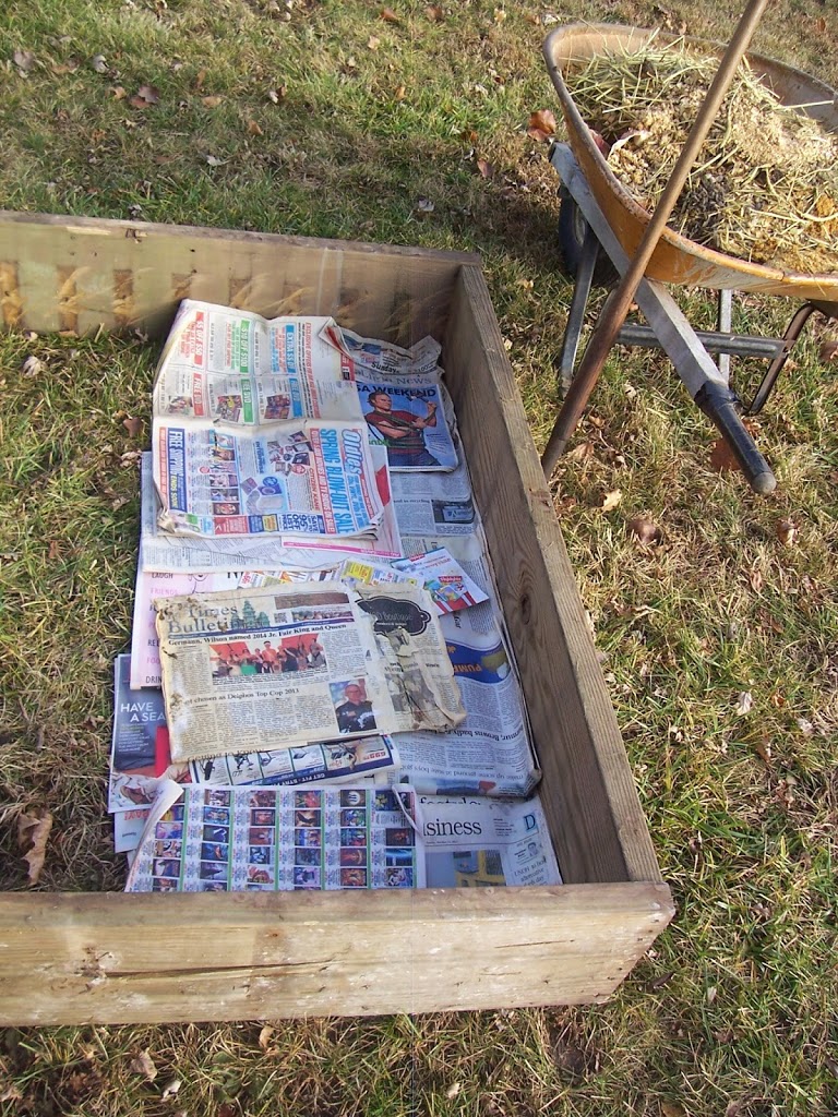 My first layer of newspaper went down, covered by a layer of the stuff out of my cavy cages – broken down wood pellets, poop/pee, and discarded hay.
