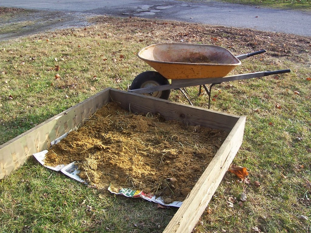 I’m going to continue this until I have a layer over the whole box, then go back and add some chopped leaves and other green material, followed by a layer of more manure.