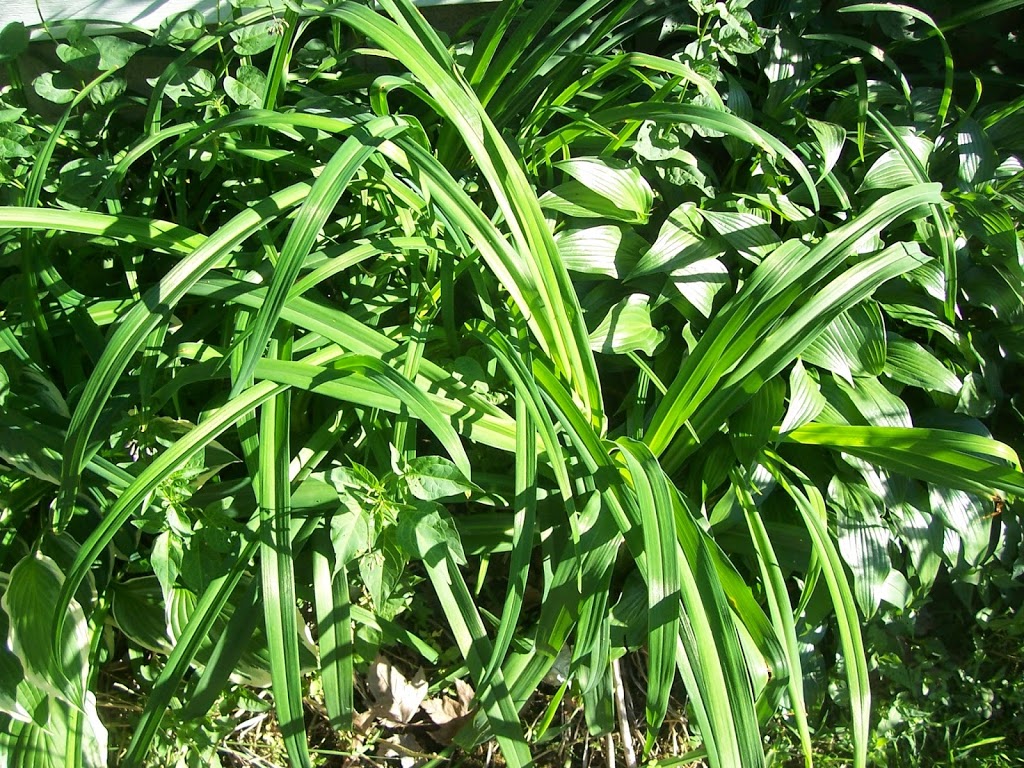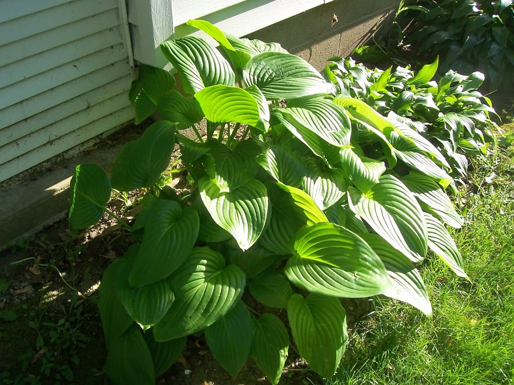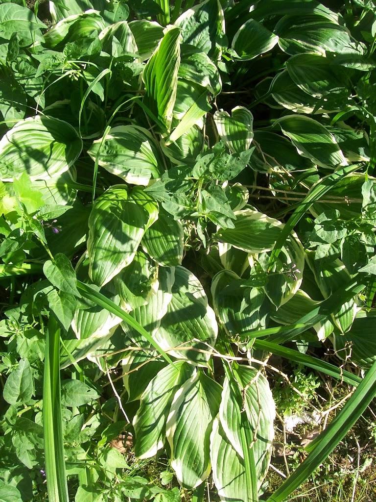 Variegated green with white outline Hosta, possibly ‘Regal Supreme’? Again, several groups, though they are somewhat overgrown with weeds.