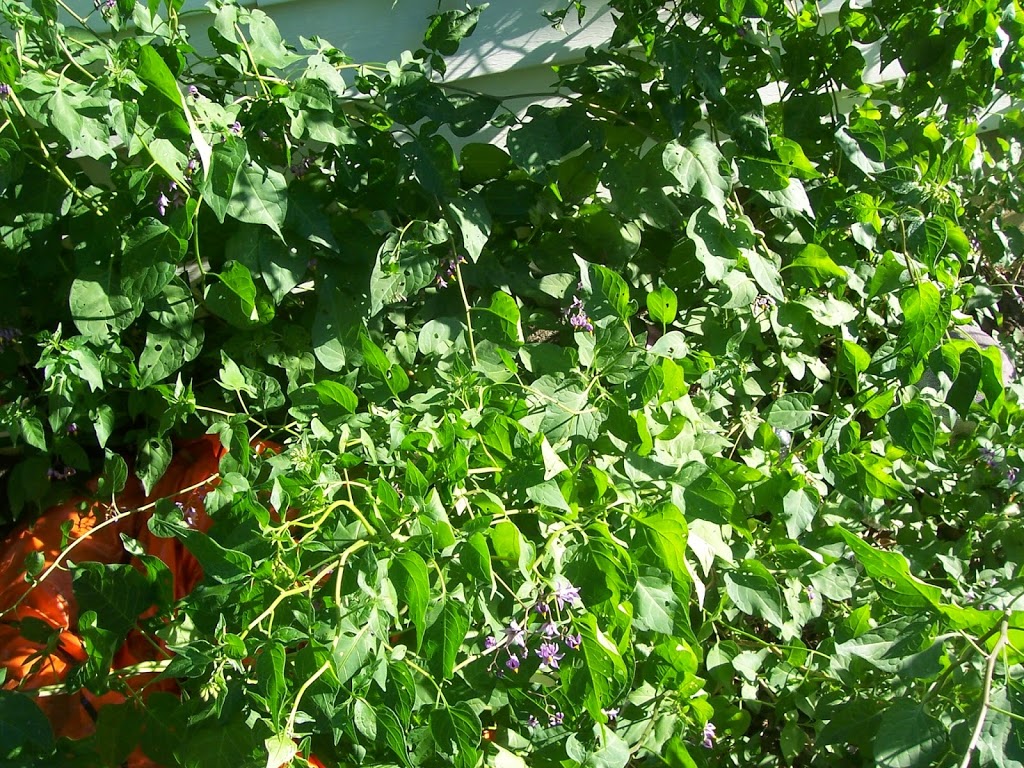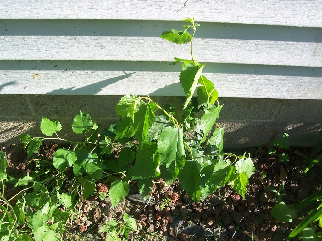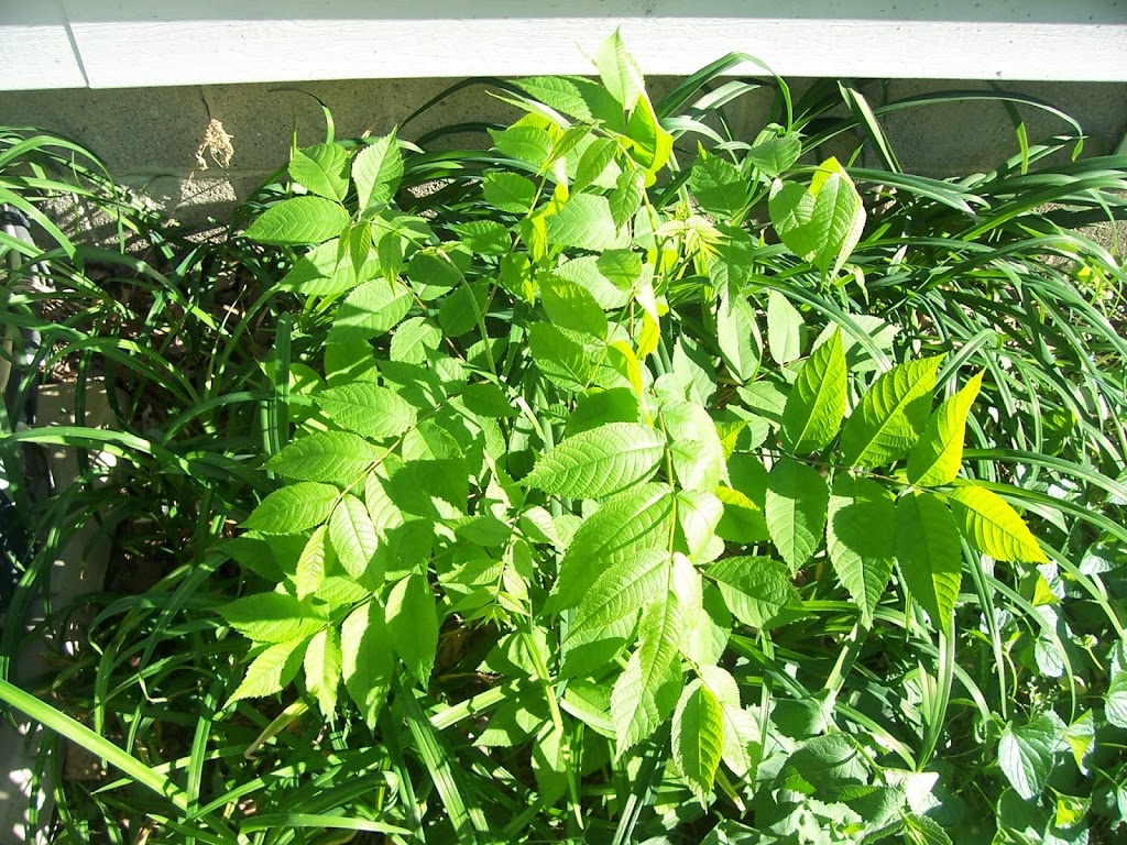 I believe this is the same as is growing on the north of the house, but on the south (and much healthier looking) as well as possibly what is growing in the bush in the front of the house. It sort of looks like a grape or a hydrangea, but I don’t really have a clue.