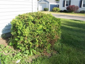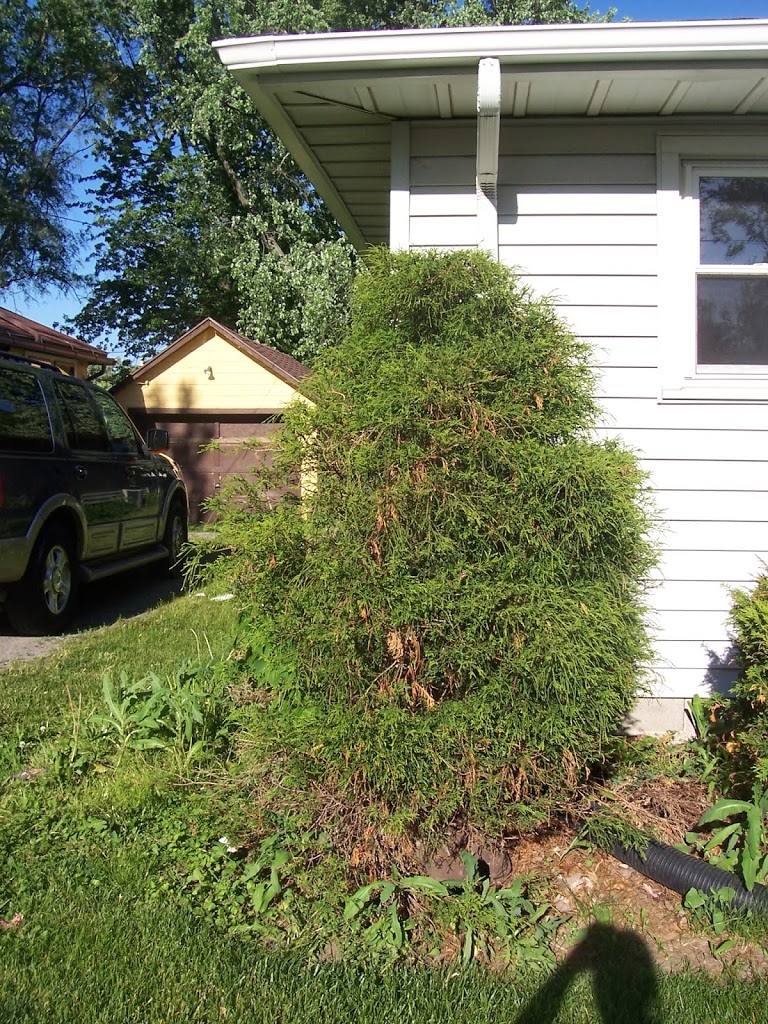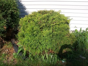 This is a single bush/shrub on the north corner of the west side of the house, it appears to have some dead growth on it, but is doing better than when I first toured the house. I’m tempted to pull it, as it makes the house look unsymmetrical, but I don’t know yet. Some sort of coniferous tree, but I don’t know what kind for sure.