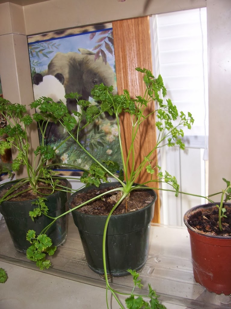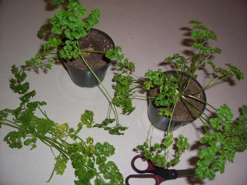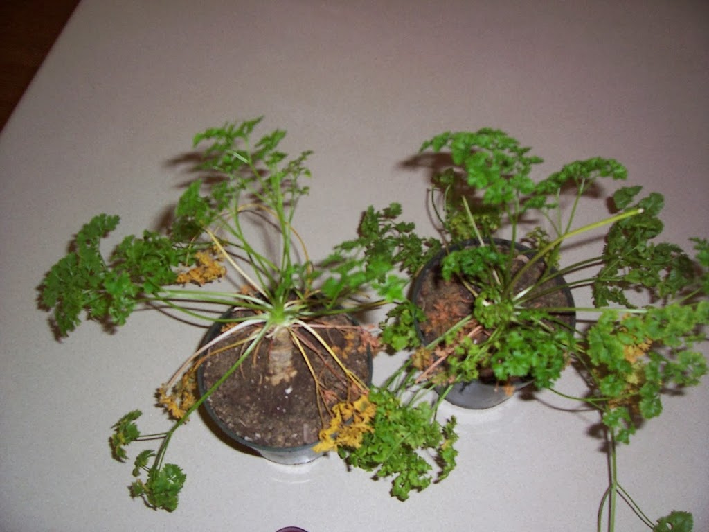 I have two parsley plants from last year, which I bought from a nursery. Parsley is a biennial, which means that they grow for two years before going to seed. I’d like mine to go to seed so I can save some and try to start my own next year (this year, I’m growing it from purchased seed, but it is flat leaf). Unfortunately, over the winter, the parsley got a little leggy, yellowed, and generally not so healthy looking. Part of the problem was that it wasn’t getting enough light, I believe, and also, it was in mom’s watering territory, and we already know that her watering isn’t the best.