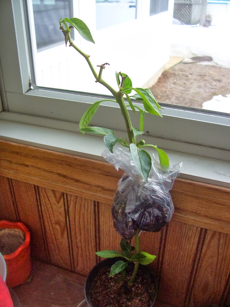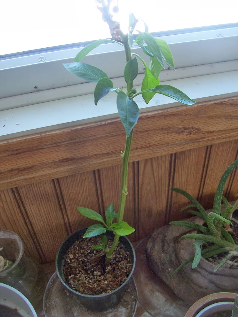 Last year at the end of the year, I bought a pepper plant that had some blooms on clearance. My thought was that I could put it inside and have some peppers over the winter. Well, I never did replant the pepper plant into a bigger pot, so all I ended up with is a spindly pepper plant. The top looks good and there is new growth coming in at the bottom, but there is a good six inch space that has no leaves, it is just stem.