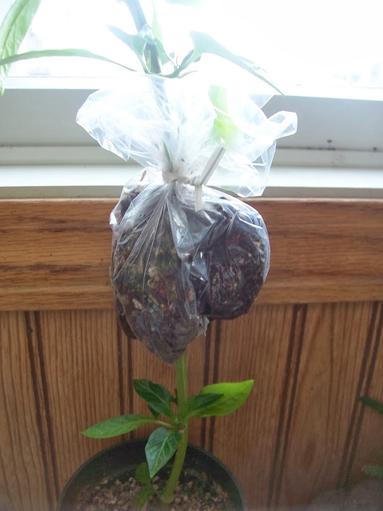 My goal is that this will hopefully grow roots from the stem and I’ll be able to cut the stem just below the bag. This will leave me with two pepper plants, rather than one, big spindly one.