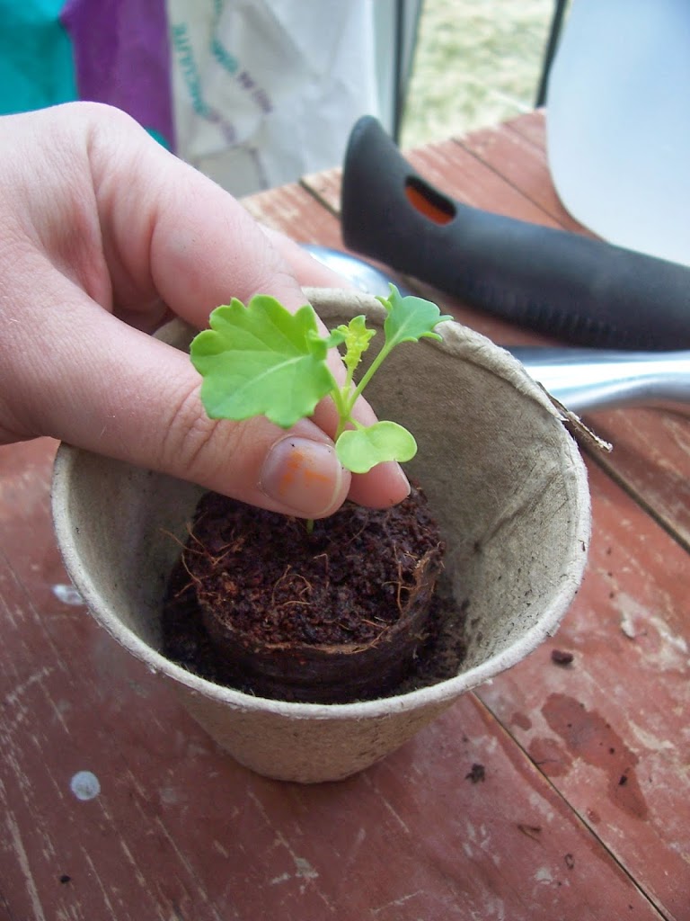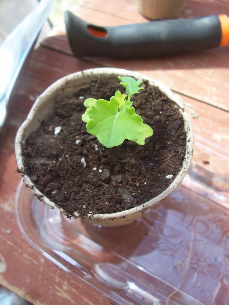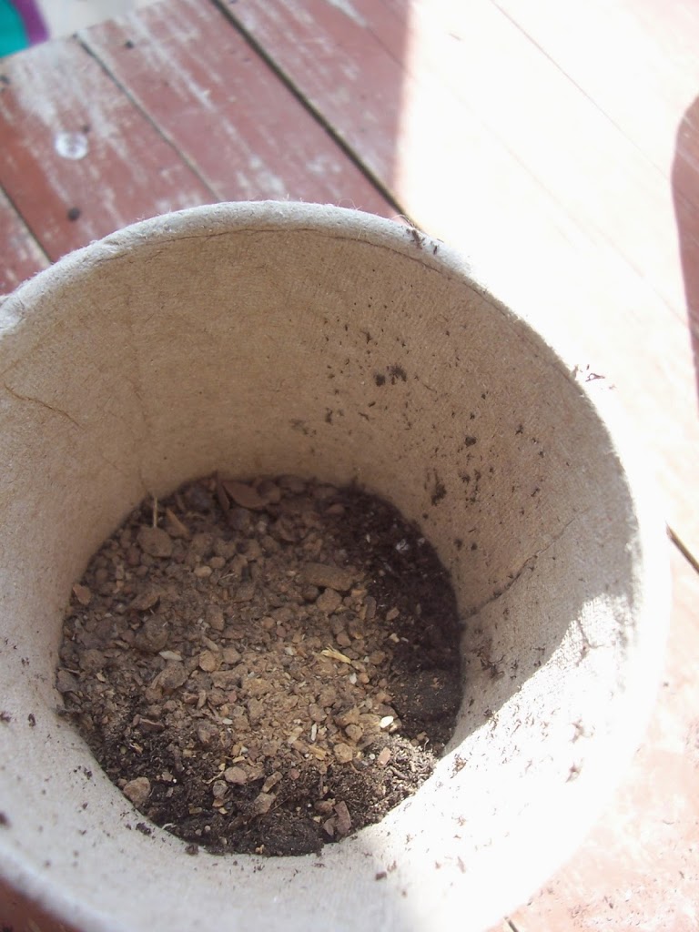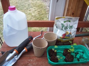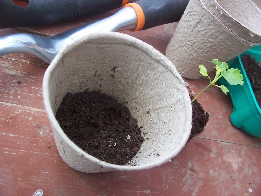 I gathered all my supplies. I decided to pot them up a bit into recycled paper pots and to give them a little organic fertilizer mixed with the soil.