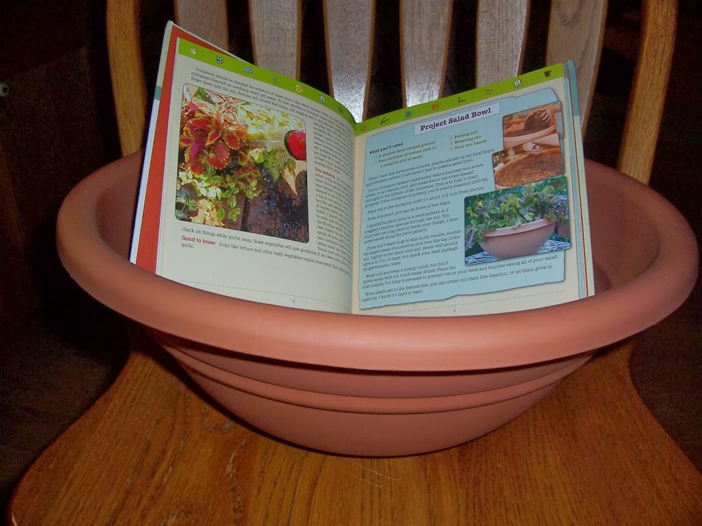 This awesome book I have been reading, The 20-30 Something Garden Guide; A no-fuss, down and dirty Gardening 101 for anyone who wants to grow stuff has a brilliant suggestion to grow a “salad bowl” with lettuce in a container.  When I was at the feed store looking at seeds, I noticed a similar bowl in the clearance section and just had to get it and make my own salad bowl.