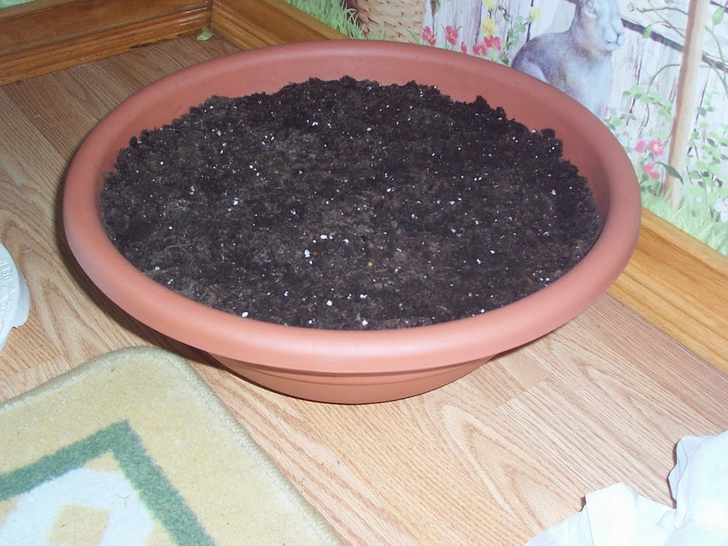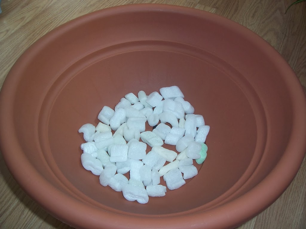 Because I’m keeping my bowl inside so I can have early lettuce, I didn’t remove the plugs from the drain holes, but instead used packing peanuts to allow good drainage for the soil.  Packing peanuts are lighter than stones, making it easier to move around.