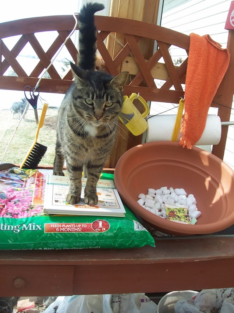 I got the rest of my supplies ready, only to find out that the bag of potting soil was frozen solid, so I set it in the sun in mom’s greenhouse to warm up.  My cat, Roxie, decided to help out with the warming process.